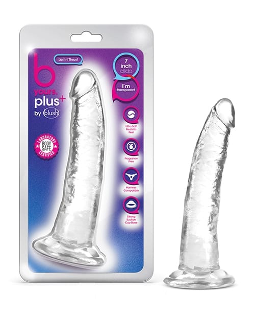 Blush B Yours Plus Lust n’ Thrust is a realistic dildo with a slight curve for G-spot and P-spot stimulation, and a sturdy suction cup base that holds to any smooth flat surface for solo time. Or partner up for strap-on harness fun! Lust n’ Thrust has a tapered head for easy insertion and is transparent for optimal viewing during play. Made of TPE, Lust n’ Thrust is phthalate free, fragrance free, and latex free. Ultrasoft (but firm enough for play!) and realistic, Lust n’ Thrust is ready to bring pleasure to your playtime! Ultrasoft and Realistic Feel.Made of TPE. Fragrance, Phthalate and Latex Free.Suction Cup Base and Harness Compatible.Transparent for Viewing During Play.7.5″ L (7″ Insertable) x 1.5″ W.